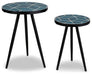 This accent table set enamors all with its striking style. The mesmerizing diamond pattern top graces your space with a splash of geometric design and a dashing two-tone teal glaze. Dazzle guests by making it a resting place for cocktails and hors d'oeuvres at parties—or keep this piece all to yourself as a bedside table for books and other baubles.