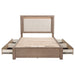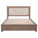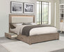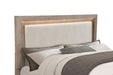 Make the most of every inch in your stylish bedroom with a modern four-drawer wooden bed that includes an upholstered headboard with LED lighting for easy ambiance. The bed boasts a barley brown finish over wood grain details, creating a soft, neutral palette with organic flair. Four drawers are tucked underneath platform slats, creating ample storage that's perfect for everything from clothing and linens to personal items. The bed is defined with a squared headboard that features an upholstered panel with foam cushioning and beige upholstery, perfect for lounging with a book or movie. Built-in LED lighting is a perfect complement, adding soft, inviting ambiance in your bedroom.