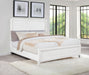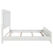 Refresh the look and feel of your bedroom with the inviting character of a modern upholstered bed. The bed features a wood frame in a distressed white finish that highlights its grain details. The headboard is a squared design complete with a padded panel upholstered in white for a monochromatic effect that's clean and contemporary. A low footboard completes the look and creates an open, inviting profile for your bedroom.