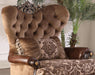 Cosmos Furniture's Phoenix transitional style Chair is suede and printed upholstery combined with brown finish wood with bronze polish on carvings. Welcome the essence of lavish living into your home with the Phoenix sofa. Shapely front posts with detailed carving, follow the elegant curve of the rolled arms that make a transition to the wood trimmed arched padded backrest which is silhouetted by a camel hump wood frame with a top center detailed carving. The base of the front posts marries to a complimentary front apron with a center carved detail. Sit in comfort on the pocket coil seating and throw pillows knowing you have the roots of great sofa design. Throw pillows are included. Matching pieces are sold separately.
