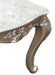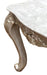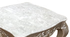 Cosmos Furniture's Emily transitional style End Table in champagne finish wood. Unafraid of the spotlight the Emily End Table has a champagne finish wood, stone top, and carved scroll details on cabriole legs. Traditional and elegant this table will stand the test of time. Matching Coffee Table sold separately. Matching other living room pieces are sold separately.