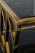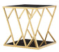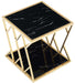 Cosmos Furniture's Julie modern style marble top End Table with metal finish is a unique geometric base. Three-dimensional, angled accent table with a lustrous gold overlay. Beautiful and sophisticated, this table is the perfect choice for a contemporary setting. It features a black faux marble tabletop which is supported on gleaming gold geometric linear metal base and additional storage space shelf offers a hint of glamour and modern styling. This elegant table will surely add a spark of life to any home decor. Matching End Table is sold separately.