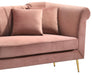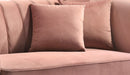 Cosmos Furniture's Lexington transitional style coral Loveseat with gold finish geometrically aesthetic sleek legs.� Make your living room look cozy with our exotic boutique Lexington collection. It's designer upholstery is super soft coral velvet with channel tufted back to add taste of modern and contemporary look. Rolled out high arms with high-density foam make the loveseat comfortable. The velvet toss pillows give you the extra comfort for your back and makes a style statement in your living room. Throw pillows are included. Matching pieces are sold separately to complete the set.