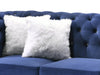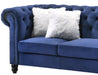 Maya Transitional Style Navy Loveseat with Espresso Legs, 34 x 34 x 69, 75lbs. Cosmos Furniture's Maya transitional style navy-blue Loveseat with espresso legs. The stunning Maya Loveseat is the perfect addition to any space with rich navy-blue velvet covers the plush. The comfortable seat is padded with high-density foam and has modern crystal tufted design on the back. Strength and beauty are guaranteed with a wood frame and espresso turned legs and rolled up sides. The decorative pillows in contrast color are included for extra support. The crystal nail head trim outlines the front edge of this beautiful piece to add an extra element of elegance. Throw pillows are included. Matching pieces are sold separately to complete the set. - Transitional Style Navy-Blue Loveseat - Espresso finish Wooden Turned Legs - Button tufted tight back - Curved rolled Arms - Nail Head trim - High-density foam - Strong hardwood frame - Drop in-coil - Two (2) Throw Pillows included - Matching pieces sold separately - -