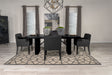 Introducing a beautiful dining room collection with clean, modern lines. The dining table boasts a oak veneer top with a black finish and a stunning tambour base design featuring fluted patterns on the double pedestal legs. The mid-century-inspired dining chairs have cushioned arms wrapped in durable charcoal grey fabric, offering comfort and style for any casual dining room.