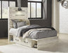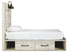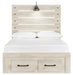 What a delightful take on rustic industrial style. Whether modern loft or modern farmhouse, this queen panel storage bed makes itself at home. The wispy whitewash palette enhances without covering the grain for that weathered look you crave. Love to read in bed? You’re sure to find the retro-chic light sconces and USB plug-ins on the open-slat style headboard such a bright idea. Elongated metal drawer pulls on the footboard storage drawers elevate the aesthetic.