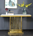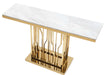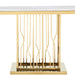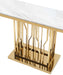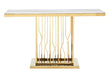 Cosmos Furniture's Pandora modern style marble top Console Table with metal finish is a unique geometric base. Beautiful and sophisticated, this table is the perfect choice for a contemporary setting. It features a white faux marble tabletop which is supported on gleaming gold geometric linear metal base offers a hint of glamour and modern styling. This elegant table will surely add a spark of life to any home decor.
